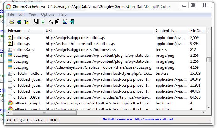 But is a mini handy tool developed by NirSoft which is named “Chrome Cache View“. Chrome cache view is a free portable tool which will directly help you to view chrome’s cache files. Due to portable, you don’t need to install it. Just run it and it will present all files exist in chrome’s cache folder.