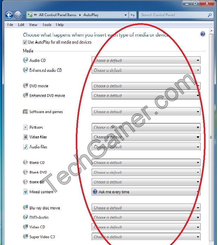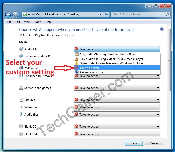 2. Now choose your settings/actions when a type of disc will be inserted into your computer.