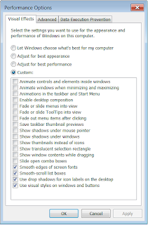 You can choose which visual effects to turn off, one by one, or you can let Windows choose for you. There are 20 visual effects you can control, such as the transparent glass look, the way menus open or close, and whether shadows are displayed.
