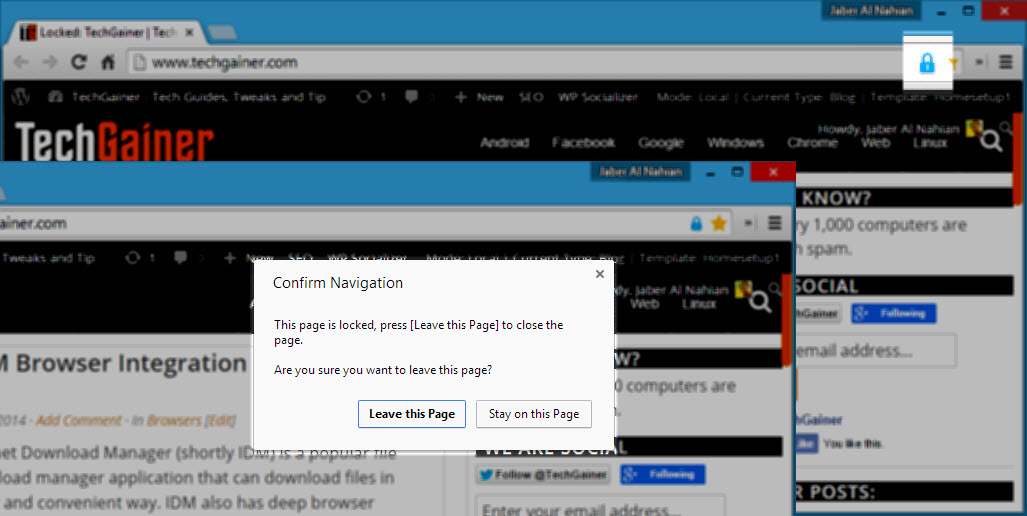 Hopefully, a simple Chrome extension Lock Tab got us covered. With Lock Tab installed, you can just click on Lock Tab icon appearing on address bar, and that tab will be locked. Whenever you try to close the tab either by clicking on cross sign or Chrome close button, it will show you a prompted dialog asking you whether you want to leave the page or not. The dialog contains two buttons: Leave this Page, Stay on this Page.
