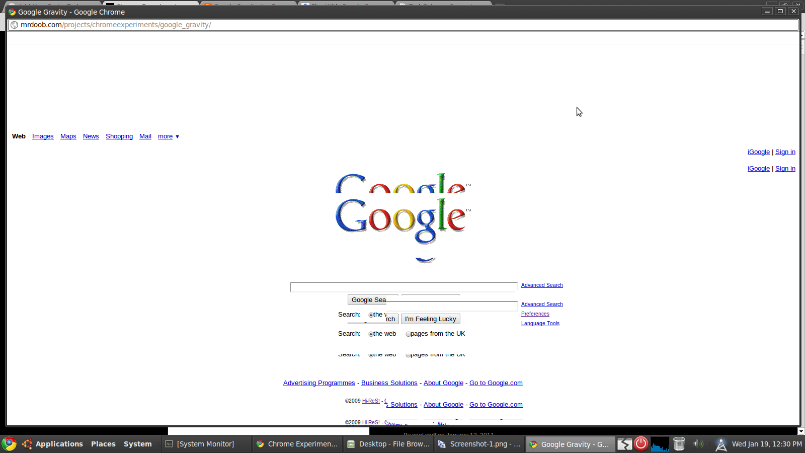 Did you heard about Google’s gravity loosing? Few days ago while surfing on web, I found this amazing funny thing where Google really looses it’s gravity! So I was thinking to share this with all of you. The term “Google gravity” is actually a Google Chrome experiment made by Ricardo Cabello and Hi-ReS!. What actually it is? Actually google gravity is a funny page where all elements of the Google home page are subjected to gravitational force and they fall down. JavaScript and box2d-js technologies are used to make it.