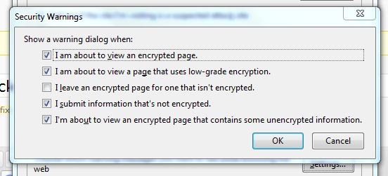 And: Tools> Options> Security> Warning messages heading-Settings: on the next window, make selections based on your ‘comfort level‘ and understanding of site security, and so on> OK.