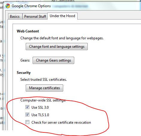 Go to the tools tab in the Google Chrome browser (the top right wrench icon). Click on “Options“. Select the tab “Under the Hood“. On the bottom of the options, check the option Use SSL 2.0/3.0 and make sure “Check for server certification revocation” is unchecked.