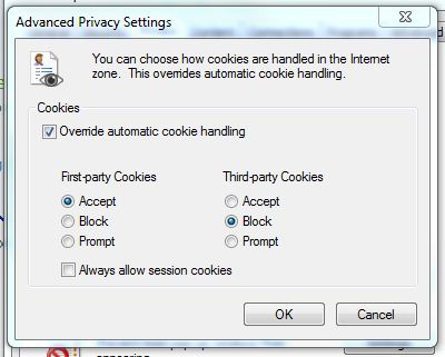 here check ‘Override automatic….’; ‘Allow session cookies’; ‘Allow 1st party cookies’ & ‘Block 3rd Party Cookies’.