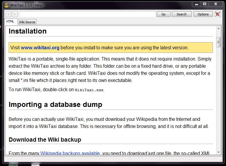 It is a portable application that delivers the Wikipedia of your choice to wherever you go. WikiTaxi enables you to read, search, and browse Wikipedia offline. No Internet connection is needed, all pages are stored in a WikiTaxi database. Because Wikipedia is constantly growing, WikiTaxi uses compression to make sure that the database stays as small as possible.